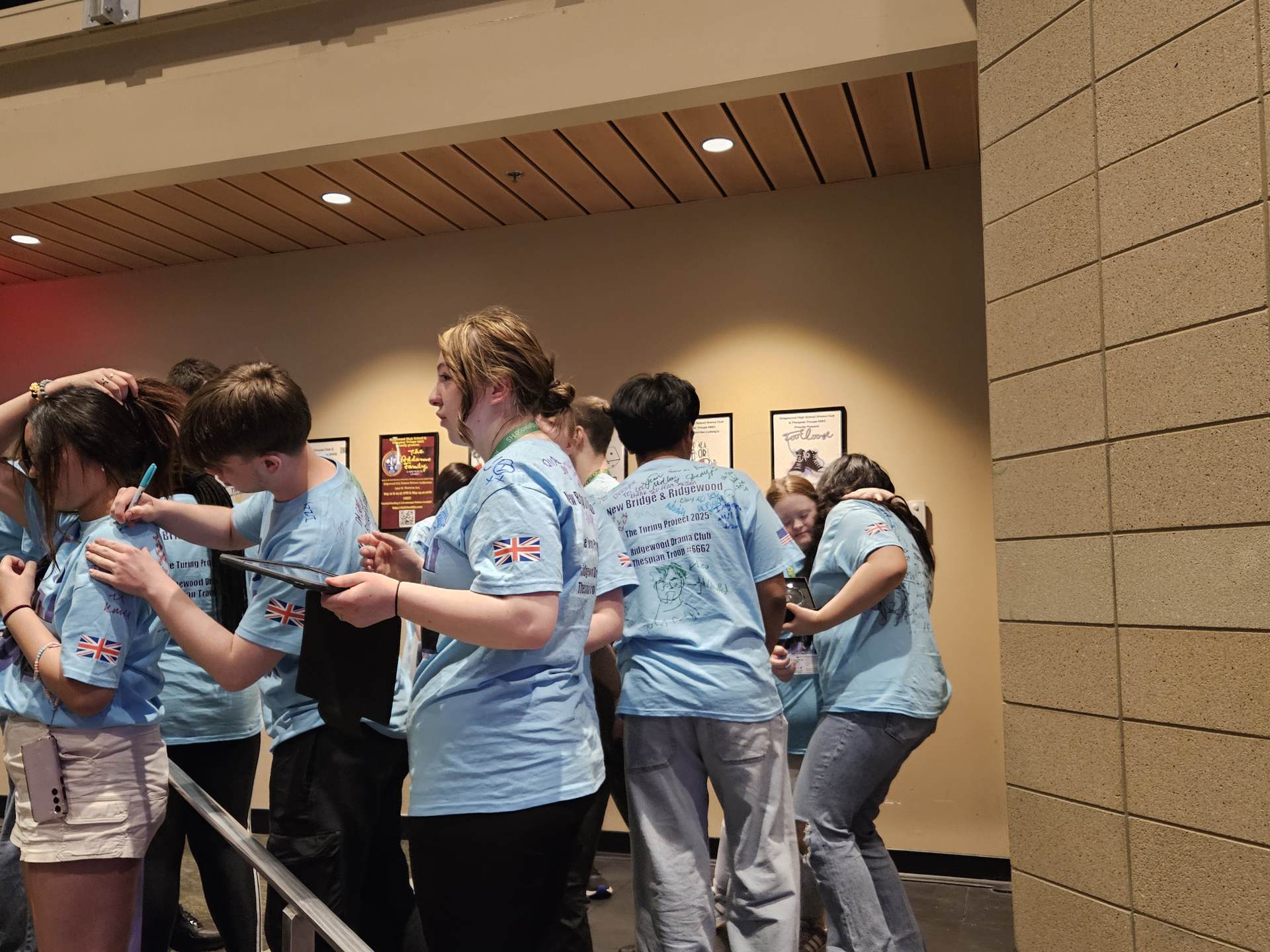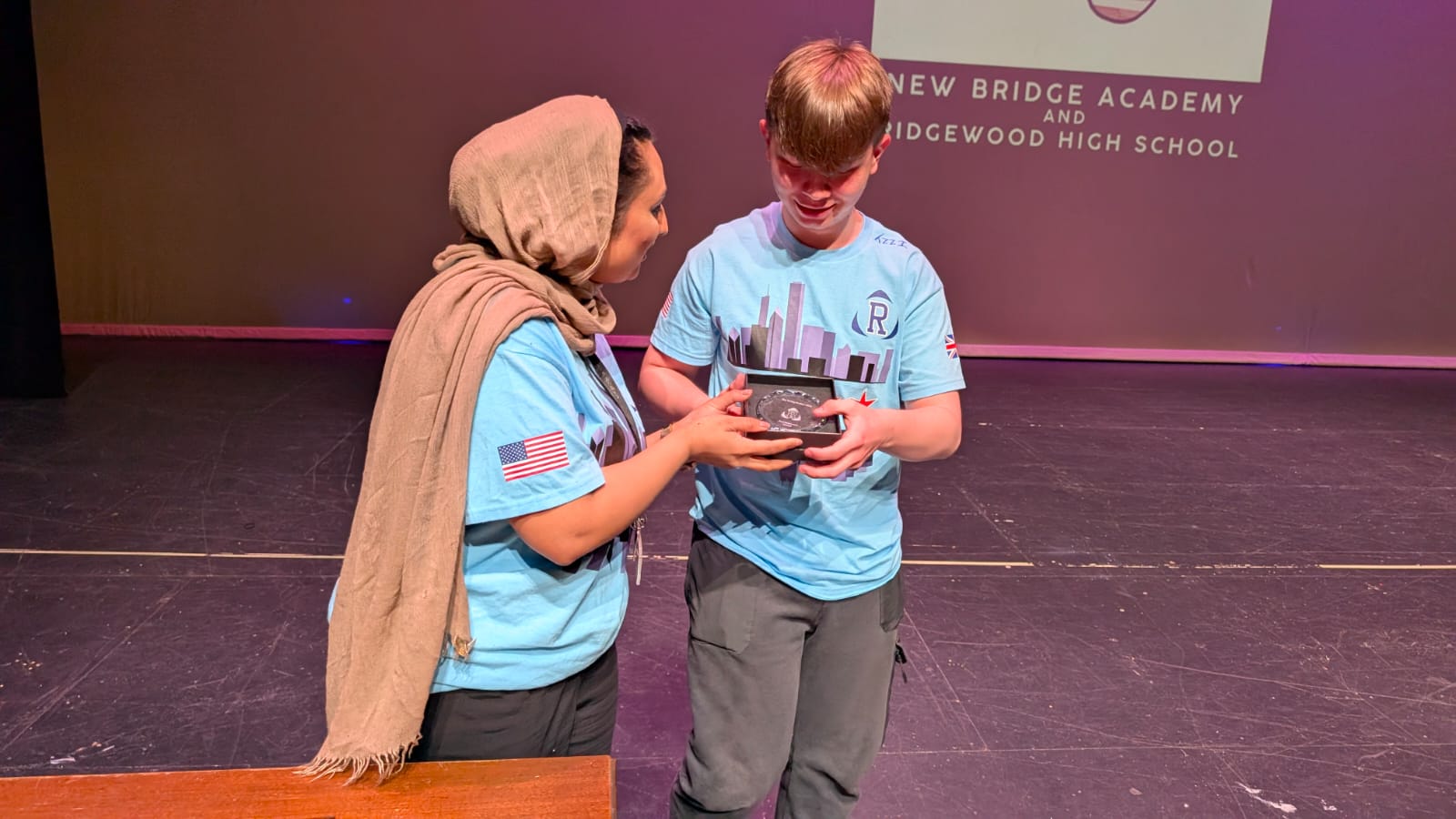 During the first section of the morning, New Bridge and Ridgewood students signed each other’s t-shirts, took selfies and lots of photographs, and the New Bridge students signed a Union Jack flag which was given to Ridgewood. In turn, Ridgewood students signed an American flag and presented it to us.