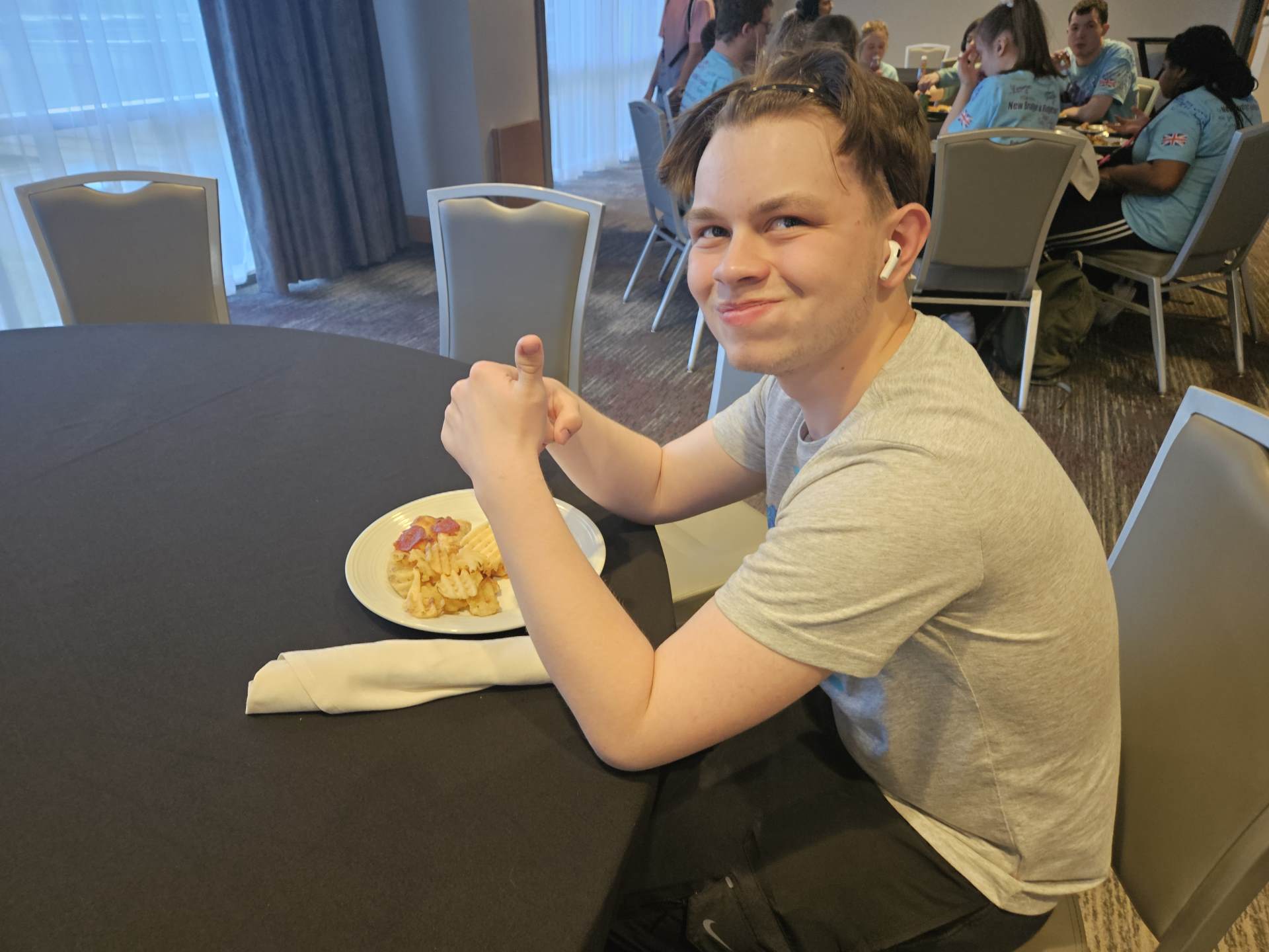 Tonight at the hotel, for our evening meal, the kitchen staff exclusively made us a variety of pizzas, waffle fries, salad and chocolate and vanilla ice cream.