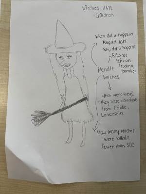 The Springboard Project focused their celebrations on ‘The Witches’, a story that continues to capture imaginations. Students explored extracts from the novel, discussing Dahl’s vivid descriptions and how he uses language to create both fear and fascination. This led to thoughtful discussions about stereotypes around witches and how these ideas have changed over time. Students also researched real witch trials from history, learning how accusations of witchcraft often reflected deeper societal issues such as fear, superstition, and prejudice.